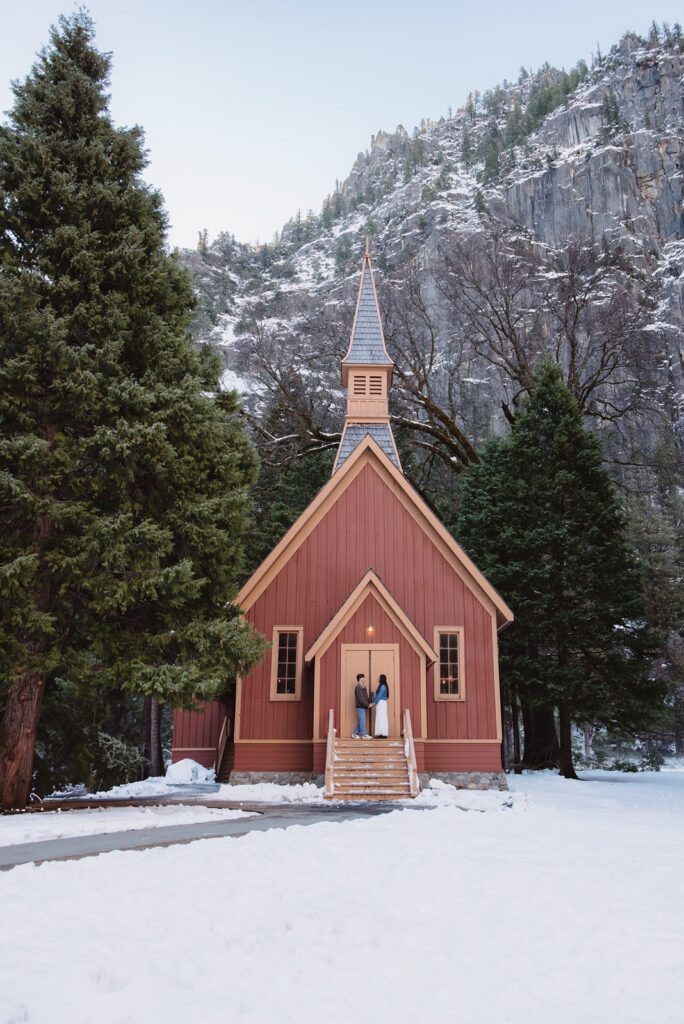 The Yosemite Chapel is a charming historic red chapel located in Yosemite Valley. It adds a unique and timeless element to photos, especially during the winter months when snow surrounds the building.