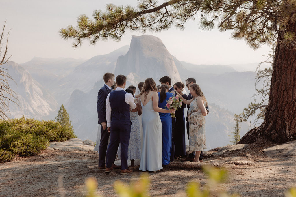 Anna and Caleb wanted their wedding day to be full of meaning, laughter, and faith surrounded by the people (and views!) they love most. The morning started with a quiet first look at Glacier Point, overlooking Yosemite Valley. Even with the smoky skies, the light was unreal and gave everything this soft, golden glow. After sharing private vows, they met their family and friends for the ceremony, everyone gathered on the overlook. It was emotional, joyful, and exactly what they’d dreamed of for their Glacier Point wedding!