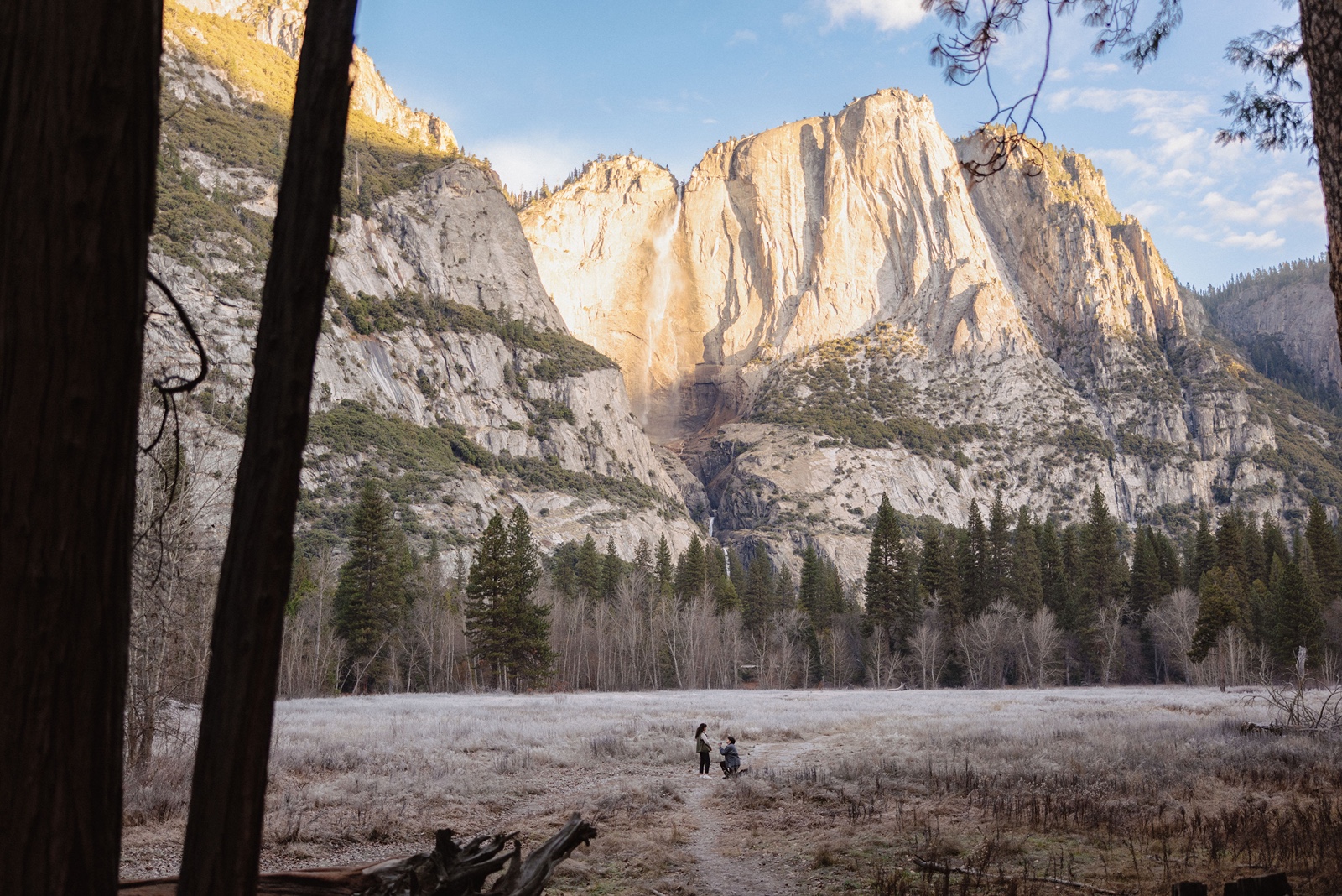 Once you reach the open riverbank, the views of Yosemite Falls and the surrounding cliffs create a stunning and peaceful setting for the proposal moment.