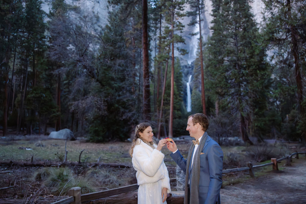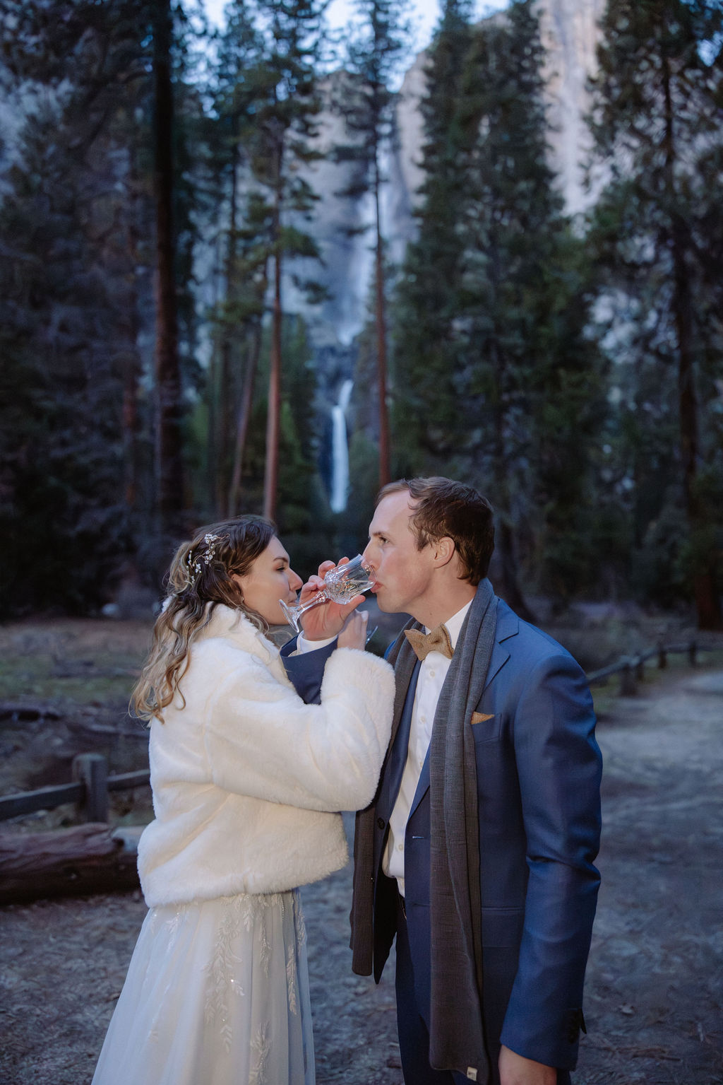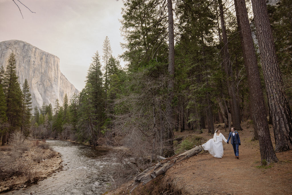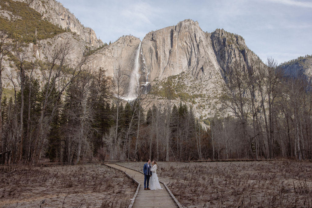 Their elopement took place in late January, which meant a slower winter pace, fewer crowds, and a quieter version of Yosemite. From a sunrise first look to a full afternoon hiking Upper Yosemite Falls, their elopement day shows how to create something meaningful, relaxed, and still physically adventurous.