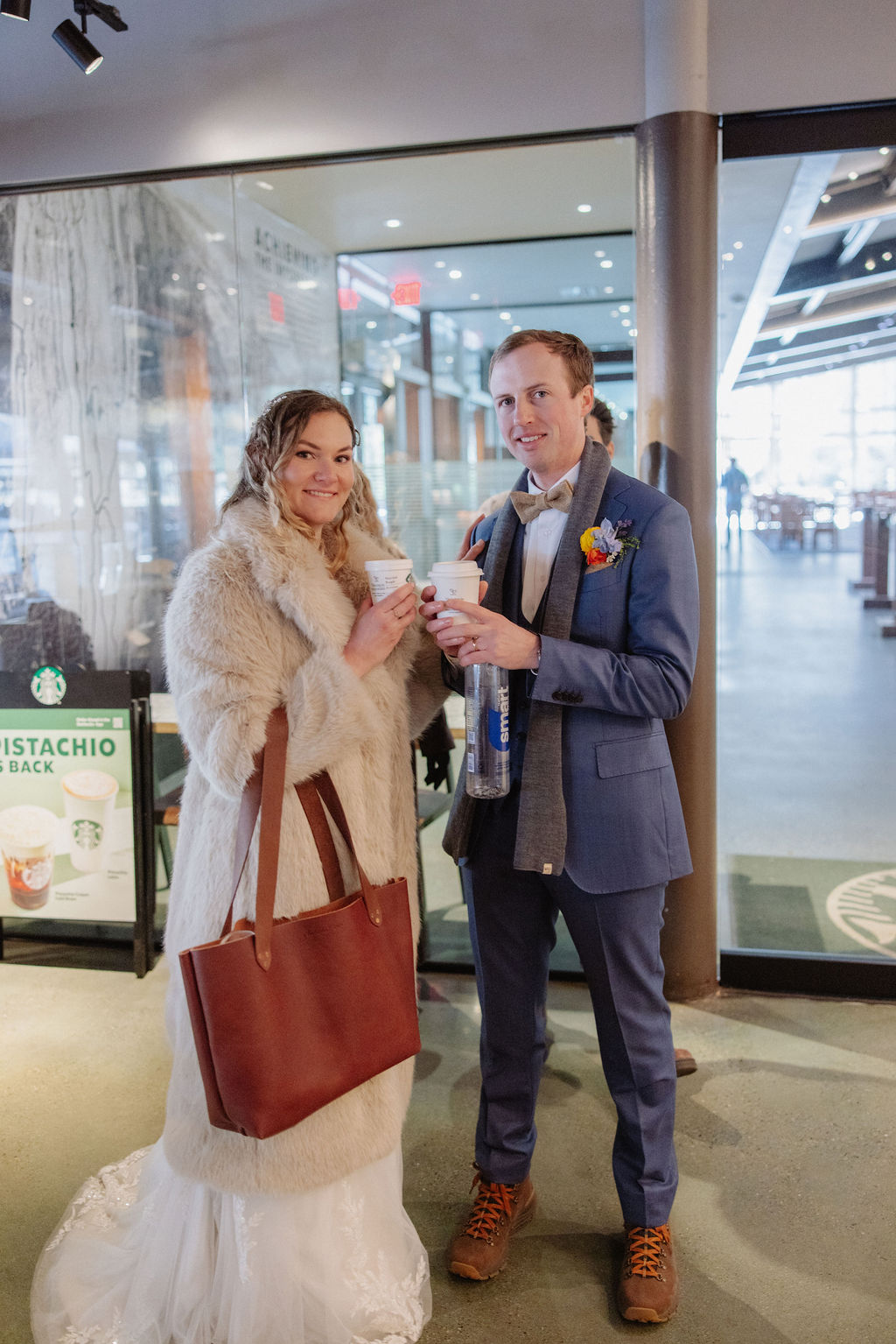 They came prepared with microspikes, extra socks, layers, and snacks. Kelly even packed a separate bag just for his jacket. They carried their wedding attire in backpacks and changed along the way, which made everything feel practical without taking away from the experience.